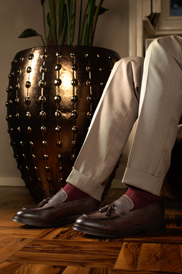 Questo significa: maggiore resistenza meccanica, migliore elasticità naturale, superiore traspirabilità, capacità di adattarsi al piede senza perdere struttura. A differenza delle pelli corrette o rigenerate, la pelle primo fiore non si sfibra, non si screpola e non si sforma con l'uso. Con il tempo sviluppa una patina autentica che arricchisce l'estetica della scarpa rendendola unica.